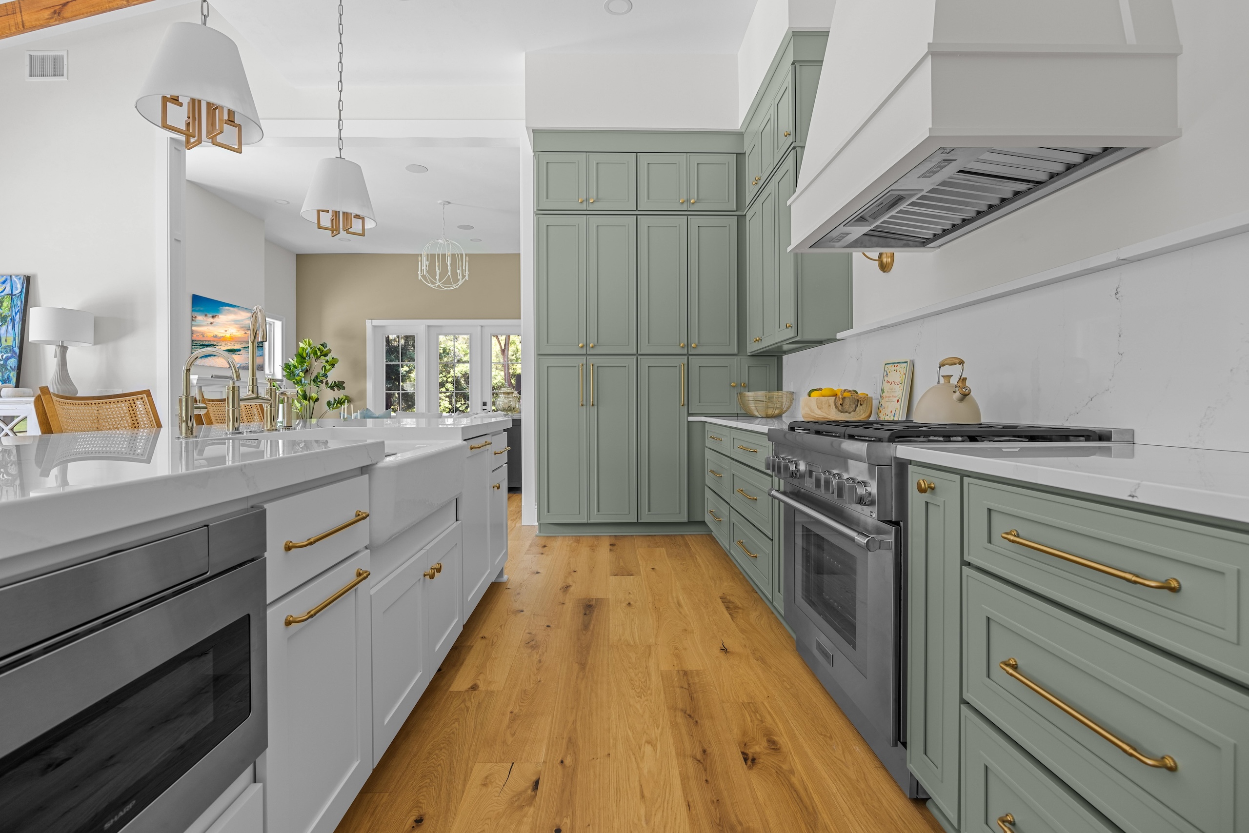 The home features a detached garage and a distinctive side yard pool, perfect for sunny days outside. Inside, the luxury kitchen is a chef’s delight, boasting state-of-the-art appliances and elegant finishes, making it the heart of this inviting abode.